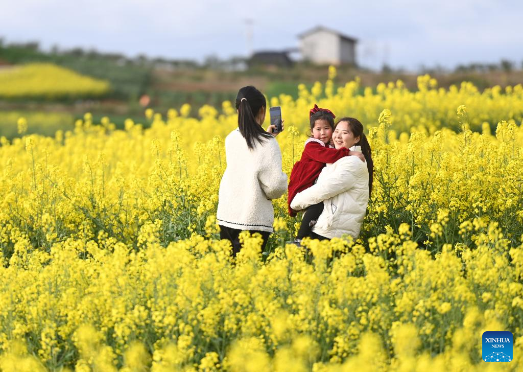 Tourists have fun in cole flower fields in Hanzhong City, northwest China's Shaanxi Province, March 18, 2023. As the temperature gradually rises, the cole flowers in full bloom have attracted many tourists to Hanzhong. In recent years, the rural revitalization of Hanzhong has been greatly promoted by the development of ecological agriculture and tourism. (Photo by Zou Jingyi/Xinhua)
