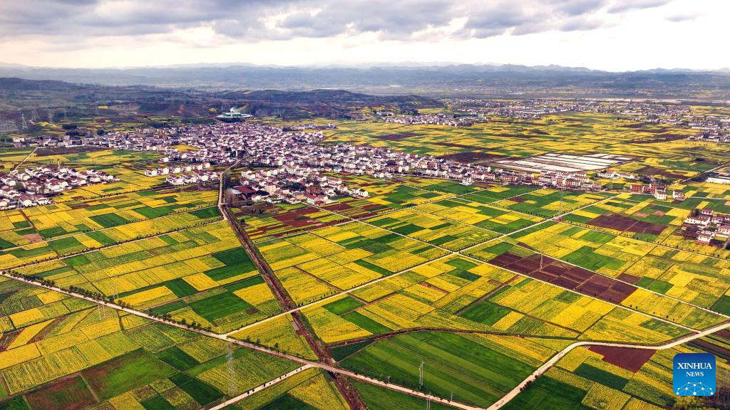 This aerial photo taken on March 16, 2023 shows cole flower fields in Yangxian County of Hanzhong City, northwest China's Shaanxi Province. As the temperature gradually rises, the cole flowers in full bloom have attracted many tourists to Hanzhong. In recent years, the rural revitalization of Hanzhong has been greatly promoted by the development of ecological agriculture and tourism. (Photo by Zou Jingyi/Xinhua)
