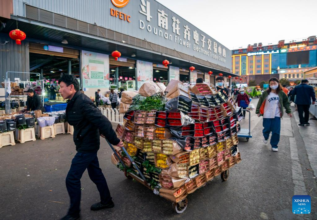 A worker transfers flowers at the Dounan Flower Market in Kunming, southwest China's Yunnan Province, Jan. 31, 2023. (Xinhua/Chen Xinbo)