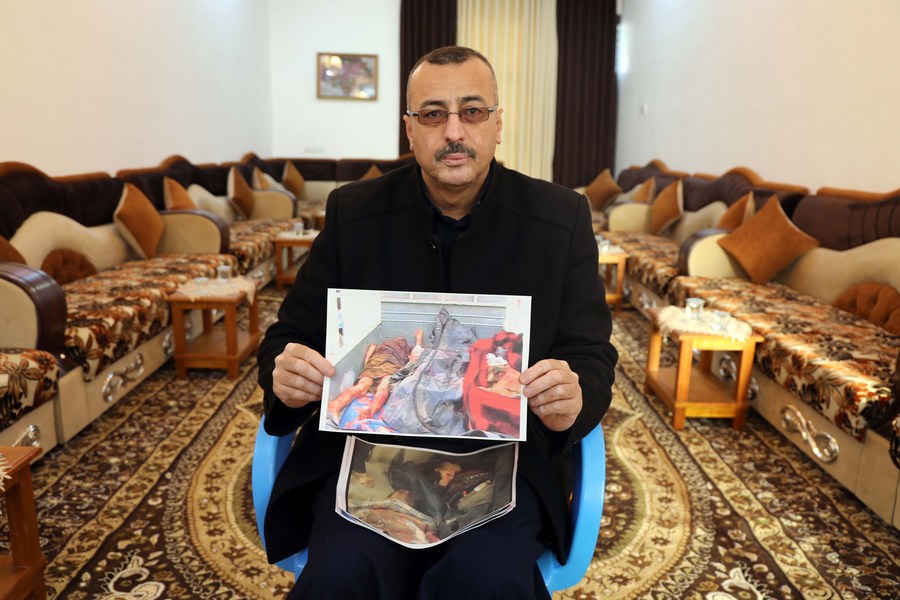 A photo taken on Feb. 10, 2023 shows Khalid Salman Rasif holding pictures of some of the victims of the Haditha massacre. Many family members of Rasif were killed during the massacre, which was committed by American soldiers on Nov. 19, 2005 in western Iraq. (Xinhua/Khalil Dawood)