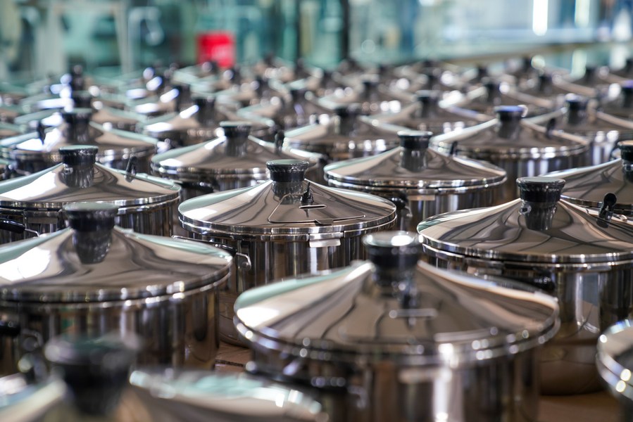 This photo taken on Nov. 27, 2022 shows pressure cookers in a factory in Lhasa, southwest China's Tibet Autonomous Region. (Xinhua/Huang Yaoman)
