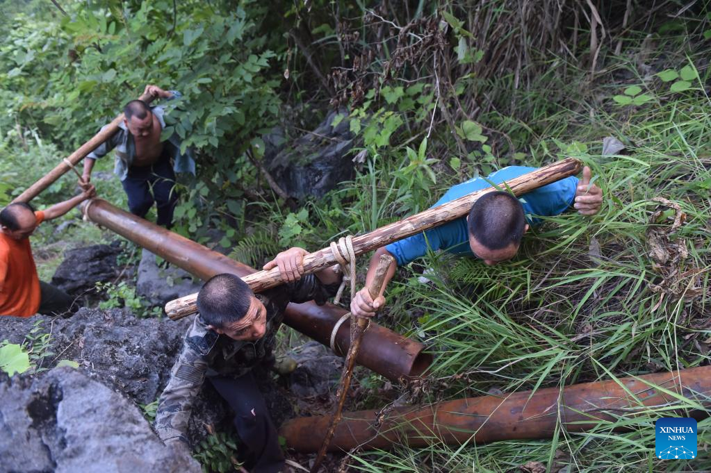This photo taken on Aug. 18, 2016 shows villagers carrying water pipes on a mountain road in Nonglei Village of Bansheng Township, Dahua Yao Autonomous County, south China's Guangxi Zhuang Autonomous Region. (Xinhua/Huang Xiaobang)