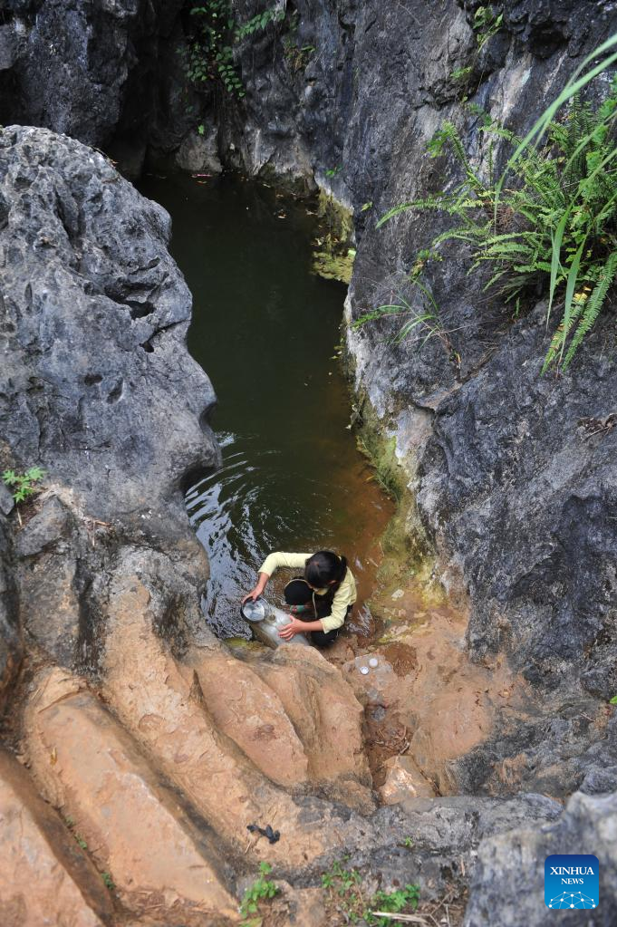 This photo taken on Sept. 3, 2012 shows a villager collecting water at a low-lying area on a mountain in Nonglei Village of Bansheng Township, Dahua Yao Autonomous County, south China's Guangxi Zhuang Autonomous Region. (Xinhua/Huang Xiaobang)