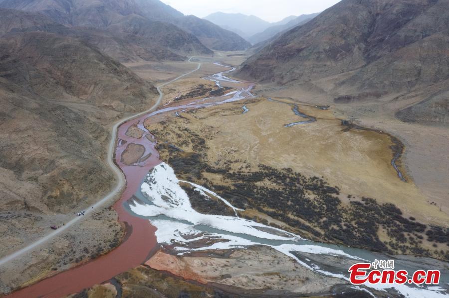 Aerial view shows two rivers meet at the confluence of Hongshui River with two colors at Dulan County, Haixi Mongolian Tibetan Autonomous Prefecture, northwest China's Qinghai Province, March 20, 2023. (Photo: China News Service/Ma Mingyan)