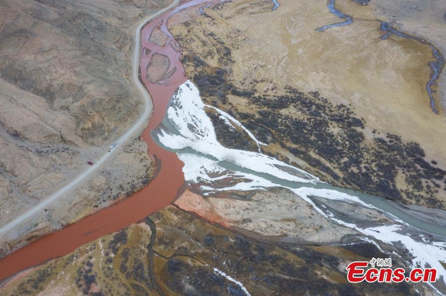 Aerial view shows two rivers meet at the confluence of Hongshui River with two colors at Dulan County, Haixi Mongolian Tibetan Autonomous Prefecture, northwest China's Qinghai Province, March 20, 2023. (Photo: China News Service/Ma Mingyan)