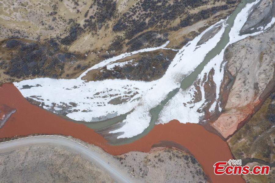 Aerial view shows two rivers meet at the confluence of Hongshui River with two colors at Dulan County, Haixi Mongolian Tibetan Autonomous Prefecture, northwest China's Qinghai Province, March 20, 2023. (Photo: China News Service/Ma Mingyan)