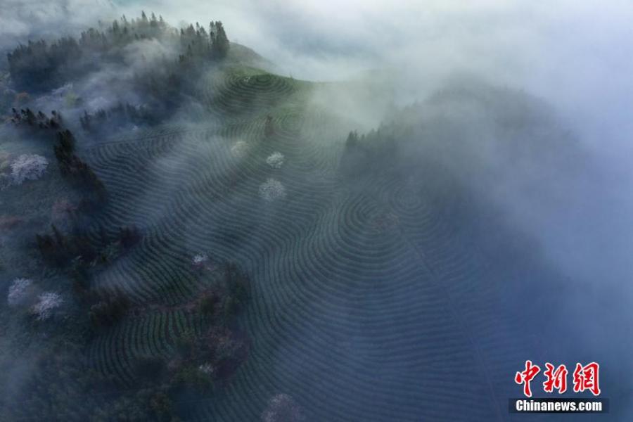 A 40-hectare tea garden with an altitude of 1,300 to 1,500 meters is shrouded in clouds, forming a beautiful picture at Hongya County, southwest China's Sichuan Province, March 21, 2023. (Photo: China News Service/Liu Zhongjun)