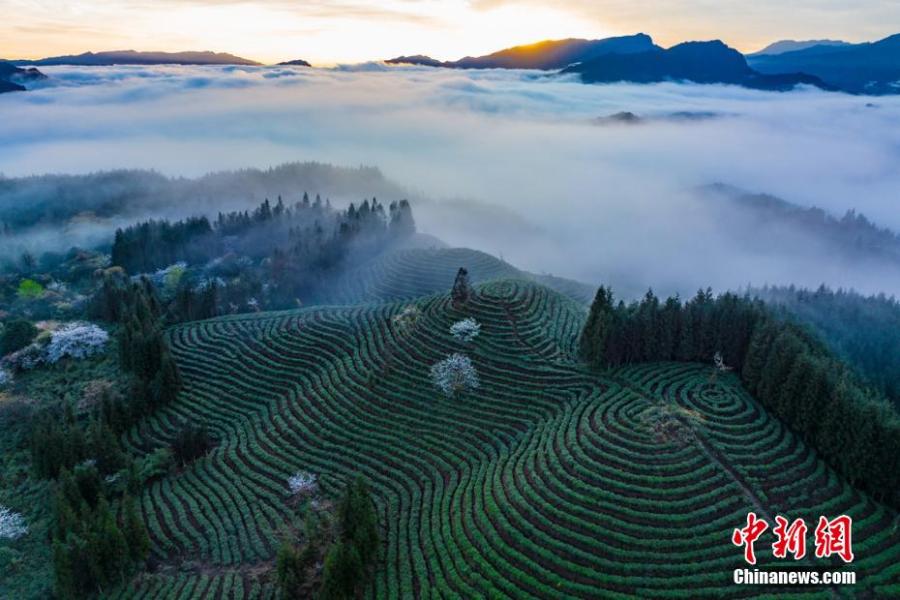A 40-hectare tea garden with an altitude of 1,300 to 1,500 meters is shrouded in clouds, forming a beautiful picture at Hongya County, southwest China's Sichuan Province, March 21, 2023. (Photo: China News Service/Liu Zhongjun)