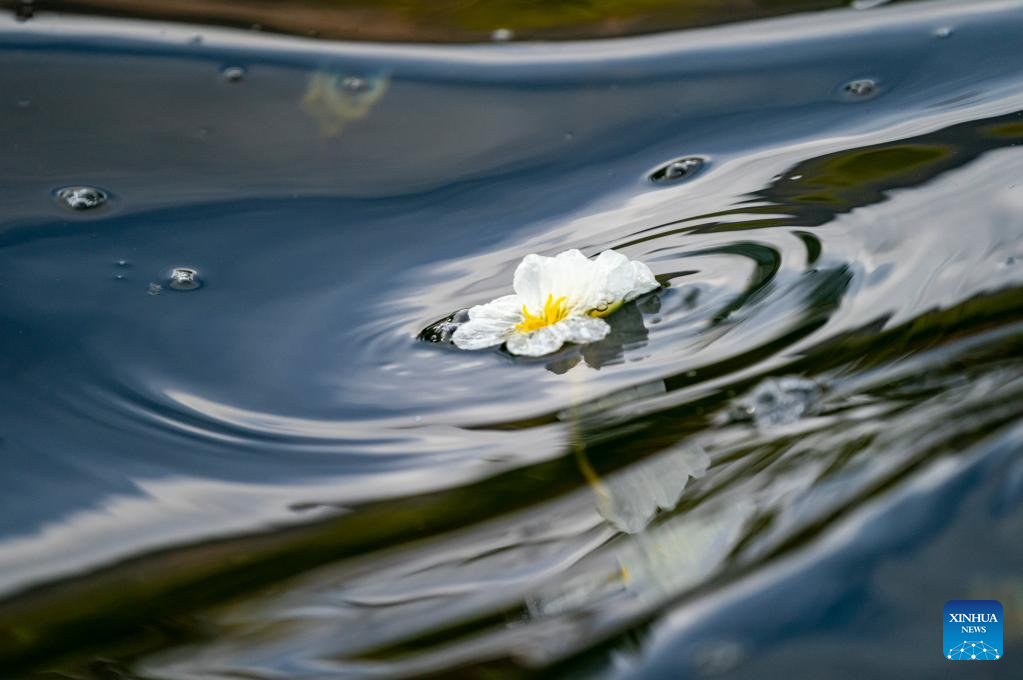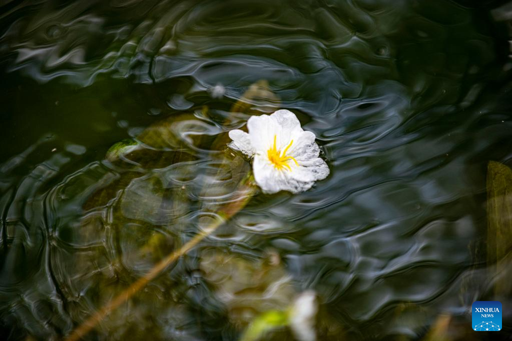 This photo taken on March 21, 2023 shows a view of the blooming ottelia acuminata in Dianchi Lake in Kunming, southwest China's Yunnan Province. Ottelia acuminata, as an indicator species of the environment, exists in fresh water. (Xinhua/Chen Xinbo)