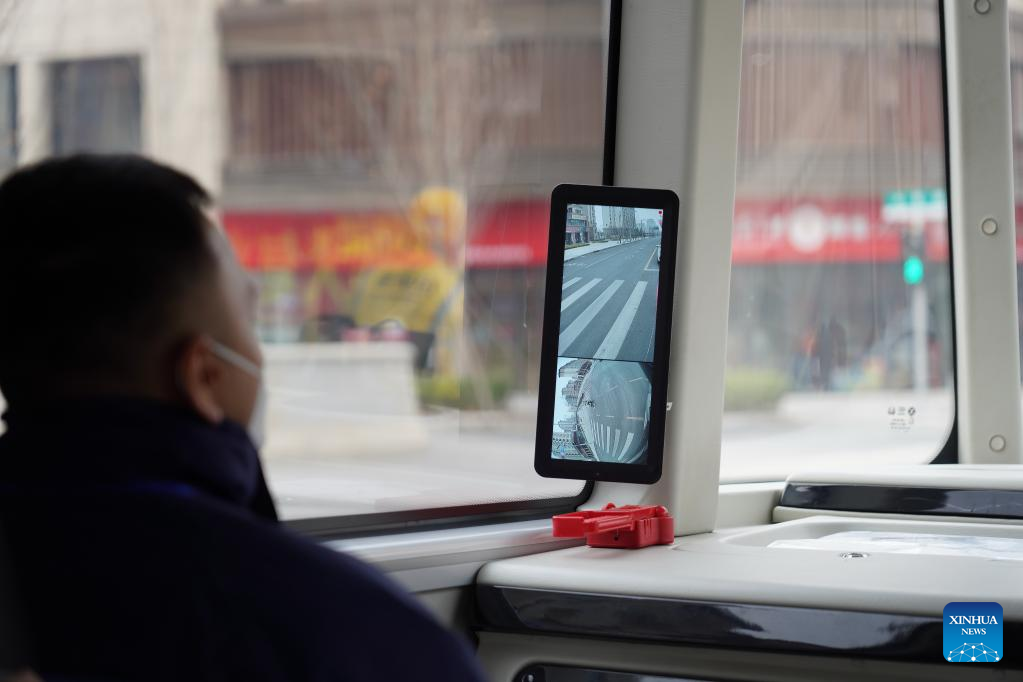 A screen displaying images captured by on-board cameras is pictured inside an intelligent connected bus in a trial operation on a street in Rongdong area of Xiong'an New Area, north China's Hebei Province, March 20, 2023. This self-driving passenger bus is equipped with high-precision sensors including laser radars, millimeter-wave radars, and HD cameras, and capable of making operational decisions in one tenth seconds. It can also cope with adverse weather conditions and complicate traffic situations. (Xinhua/Du Yifang)