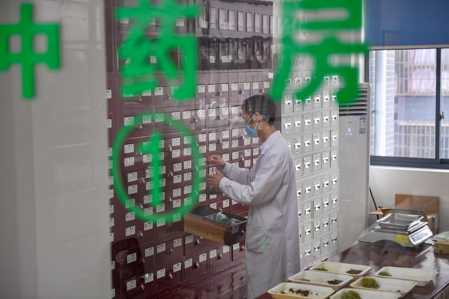 A pharmacist dispenses traditional Chinese medicine (TCM) at a health center in Qiaokou Town, Wangcheng District, Changsha, central China's Hunan Province, Jan. 17, 2023.(Xinhua/Chen Zeguo)