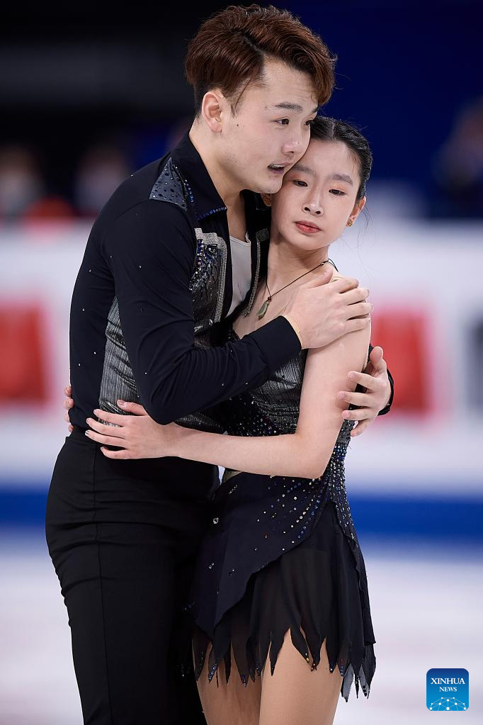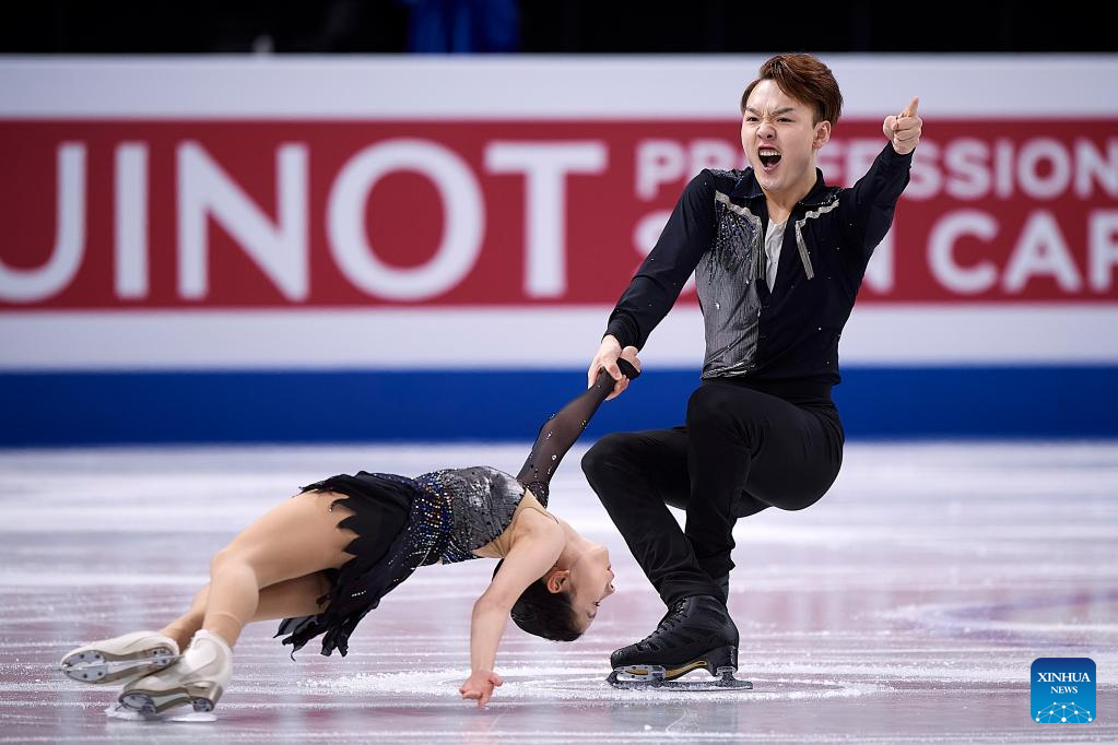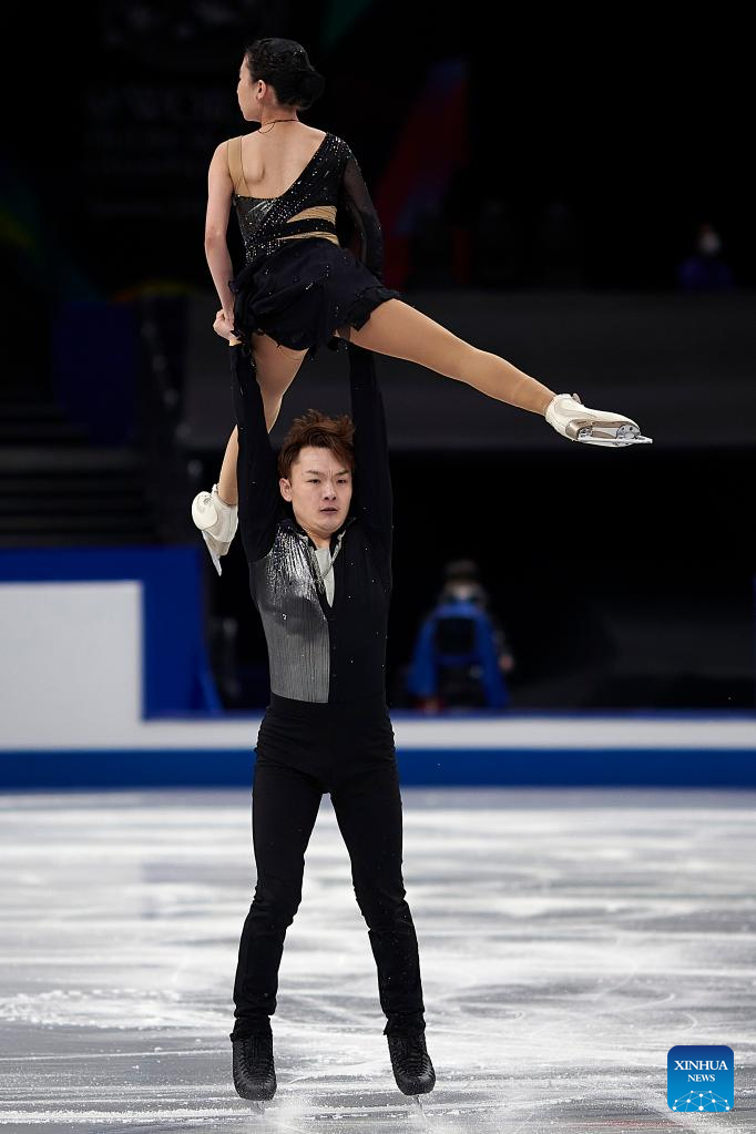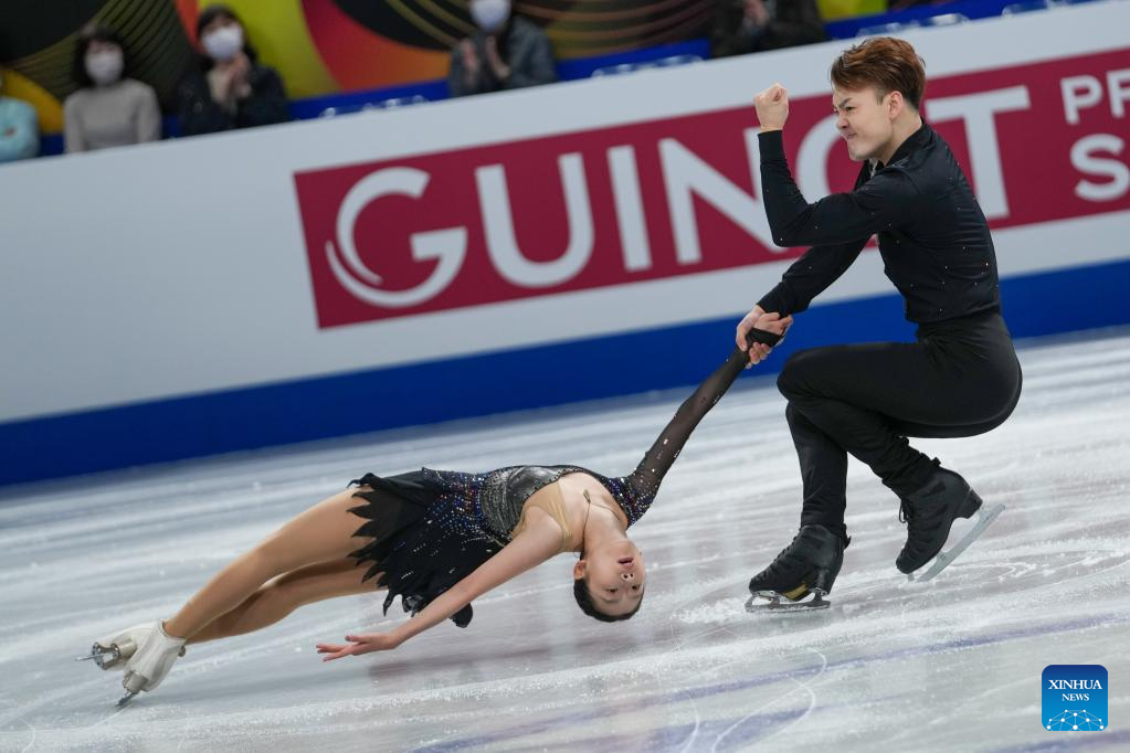 Zhang Siyang (top)/Yang Yongchao of China perform during the pairs short program at the ISU World Figure Skating Championships held at Saitama Super Area in Saitama, Japan, March 22, 2023. (Xinhua/Zhang Xiaoyu)