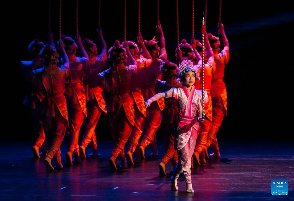 Actors perform on stage at the Shandong Grand Theatre in Jinan, east China's Shandong Province, March 21, 2023. The 11th China Acrobatic Exhibition is held on March 16-29 in Jinan. This year's event features a series of acrobatic and magic shows as well as acrobatic dramas. (Xinhua/Xu Suhui)