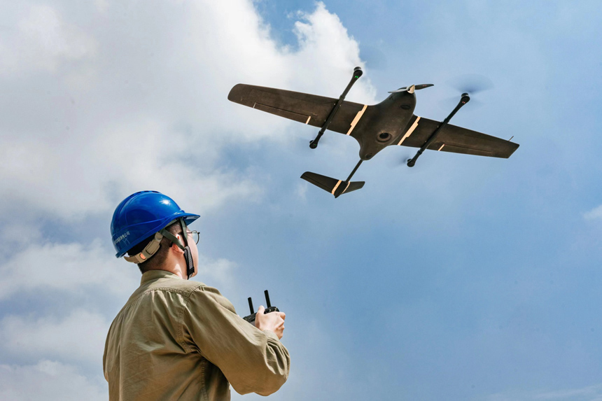 A staff member from the State Grid Wuhan Power Supply Company operates a drone to conduct intelligent power inspections in Wuhan, central China’s Hubei Province. (Photo/Wang Chen)