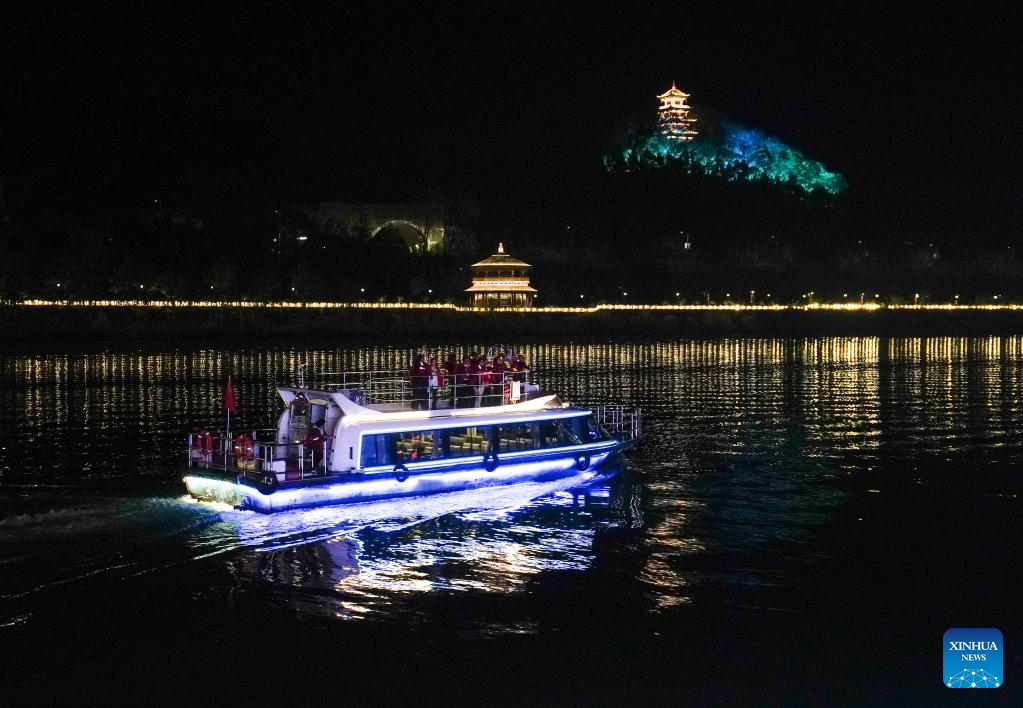 Performers stage a show on Jialing River in Langzhong, southwest China's Sichuan Province, March 21, 2023. In recent years, Langzhong has launched several live performances featuring local cultural elements to enhance tourists' night tour experience and boost the local cultural tourism. (Xinhua/Liu Chan)