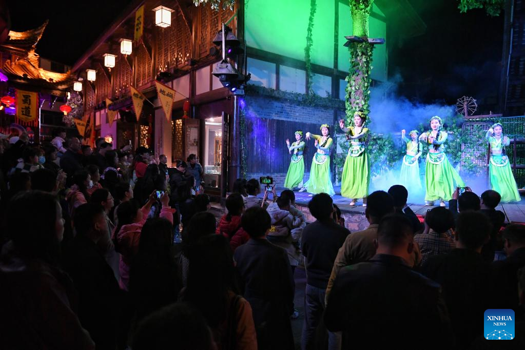 Tourists watch a performance at an ancient town in Langzhong, southwest China's Sichuan Province, March 20, 2023. In recent years, Langzhong has launched several live performances featuring local cultural elements to enhance tourists' night tour experience and boost the local cultural tourism. (Xinhua/Liu Kun)