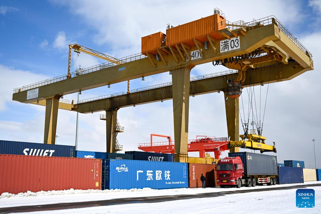 A crane loads containers at the Manzhouli Railway Station in Manzhouli, north China's Inner Mongolia Autonomous Region, March 15, 2023. (Xinhua/Bei He)