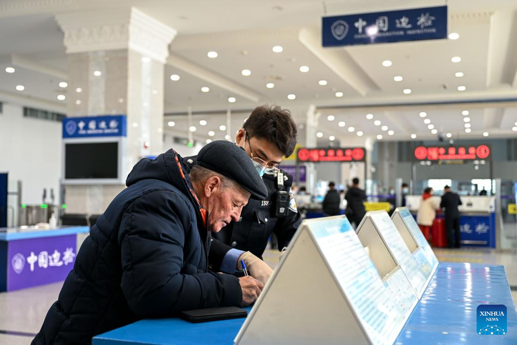 A police officer helps a foreign passenger fill in an entry card at the customs control section of the highway port in Manzhouli, north China's Inner Mongolia Autonomous Region, March 15, 2023. (Xinhua/Bei He)