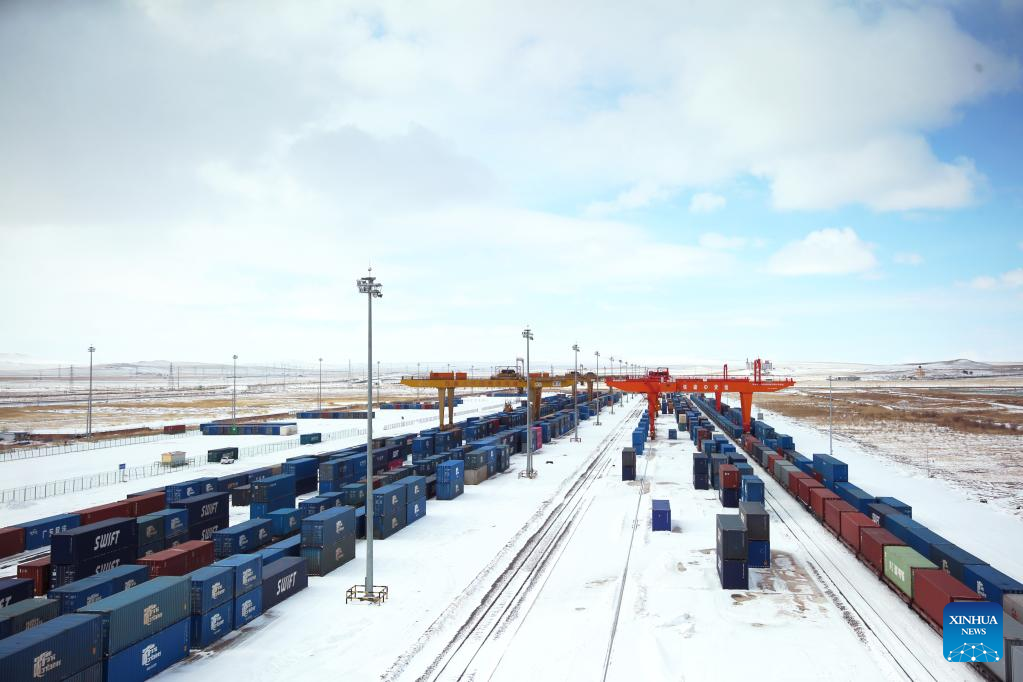 This photo taken on March 15, 2023 shows a container terminal at the Manzhouli Railway Station in Manzhouli, north China's Inner Mongolia Autonomous Region. (Xinhua/Wang Kaiyan)