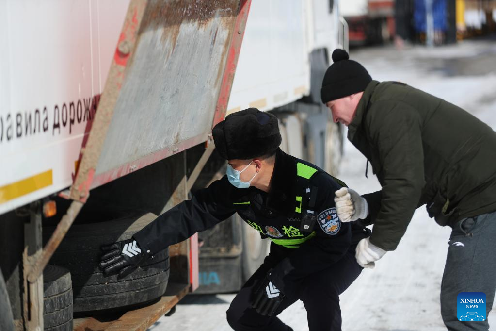 A police officer (L) carries out safety check on a cargo truck at the highway port in Manzhouli, north China's Inner Mongolia Autonomous Region, March 15, 2023. (Xinhua/Wang Kaiyan)