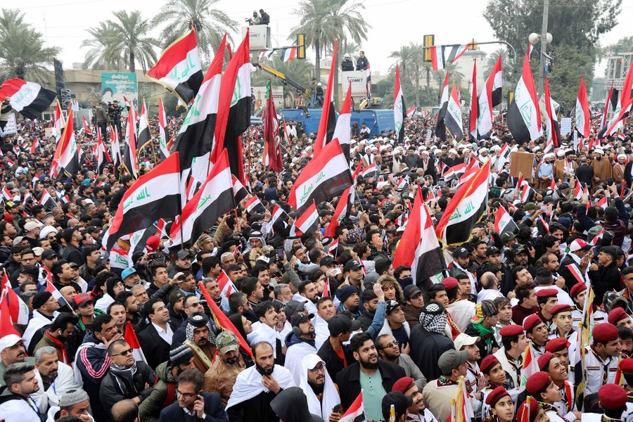 Iraqi protesters take part in a demonstration against the presence of U.S. troops in the country in Baghdad, Iraq, Jan. 24, 2020. (Xinhua/Khalil Dawood)