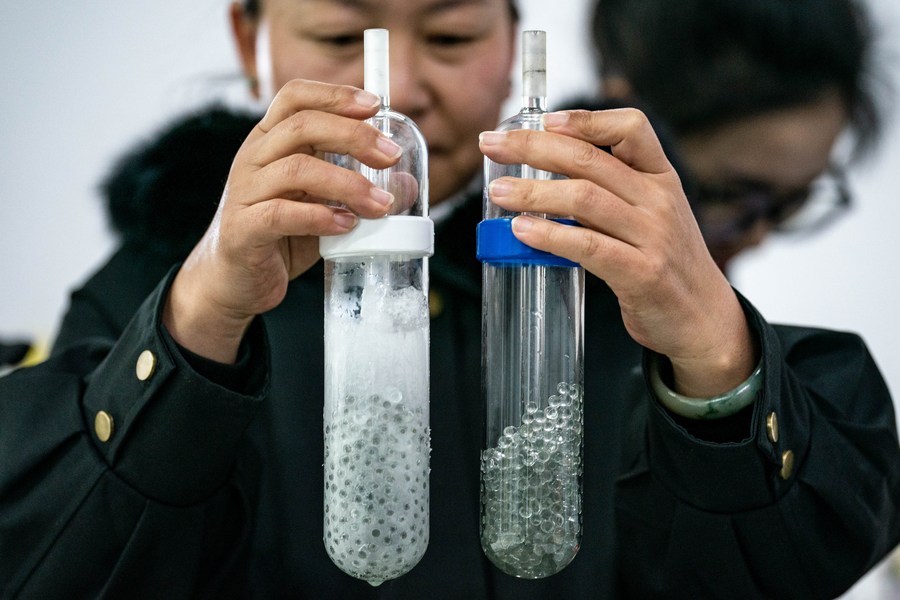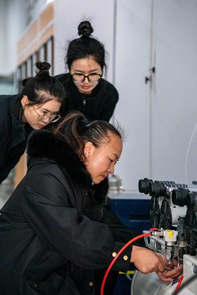Staff members Yin Yuemiao (C), Peng Xiaoqing (L) and Li Xiaoli conduct inspection of reactive gases at Shangri-La National Atmospheric Background Station in the Deqen Tibetan Autonomous Prefecture of southwest China's Yunnan Province, on March 9, 2023. (Xinhua/Hu Chao)