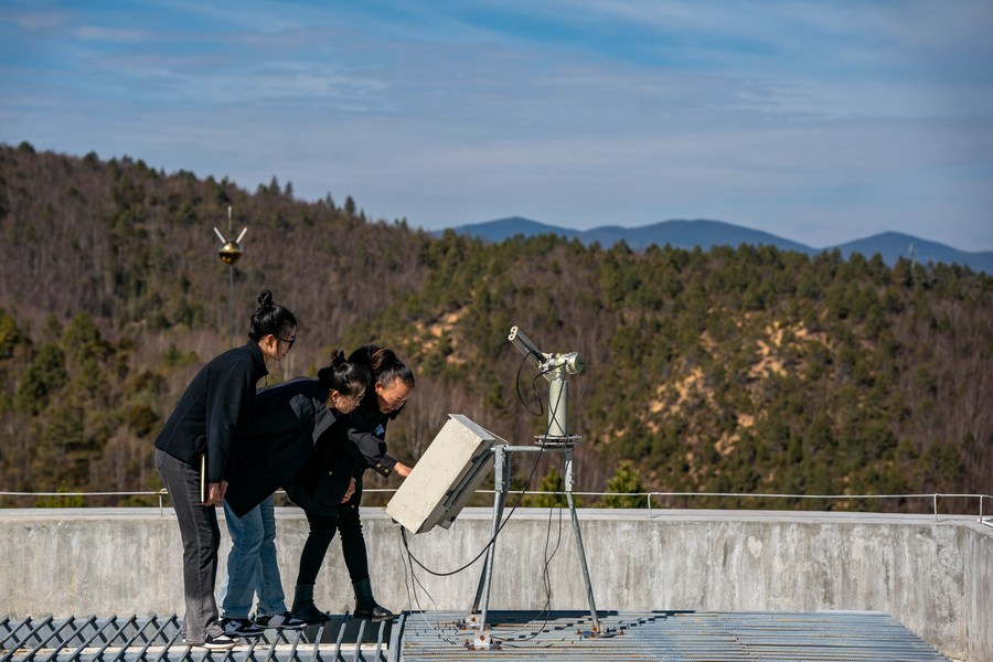 Staff members Peng Xiaoqing (R), Yin Yuemiao (C) and Li Xiaoli work at Shangri-La National Atmospheric Background Station in the Deqen Tibetan Autonomous Prefecture of southwest China's Yunnan Province, on March 9, 2023. (Xinhua/Hu Chao)