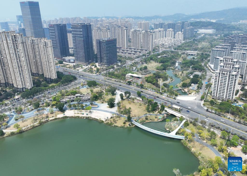 This aerial photo taken on March 22, 2023 shows a view of Jin'an Park, an ecological corridor in downtown Fuzhou, southeast China's Fujian Province. (Xinhua/Lin Shanchuan)