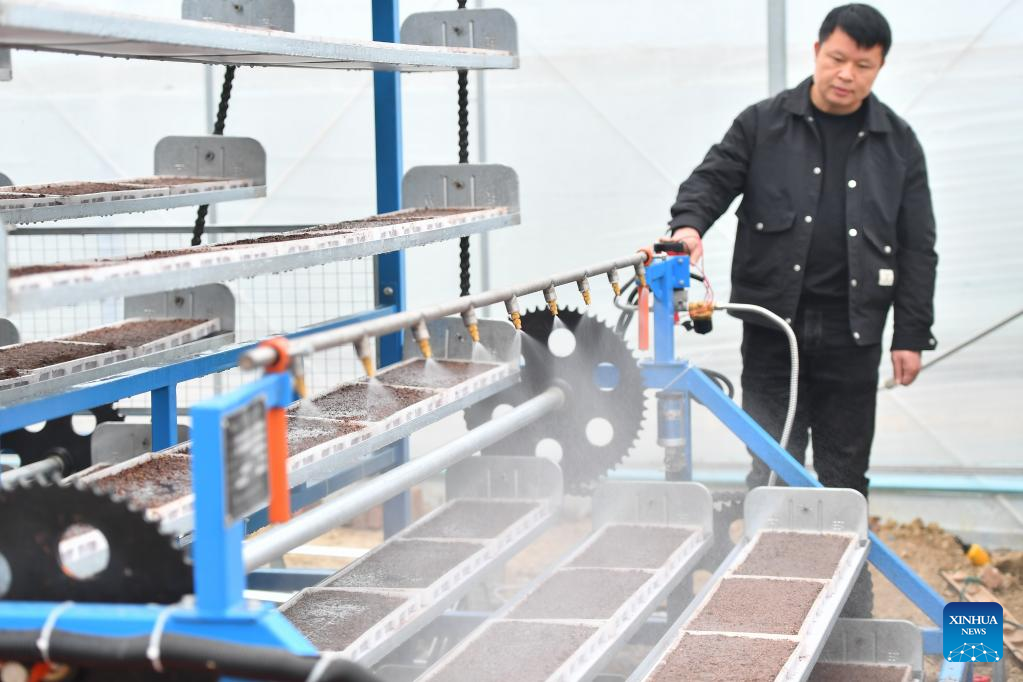 A seedling breeding machine sprays water on seedlings at a multi-functional greenhouse in Yuhu District of Xiangtan City, central China's Hunan Province, March 23, 2023. (Xinhua/Chen Zeguo)