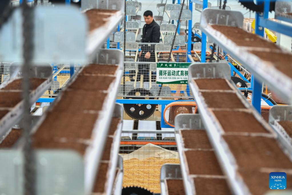 A seedling breeding machine works at a multi-functional greenhouse in Yuhu District of Xiangtan City, central China's Hunan Province, March 23, 2023. (Xinhua/Chen Zeguo)