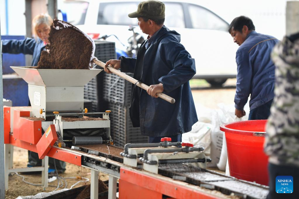 A farmer makes seedling trays at a multi-functional greenhouse in Yuhu District of Xiangtan City, central China's Hunan Province, March 23, 2023. (Xinhua/Chen Zeguo)