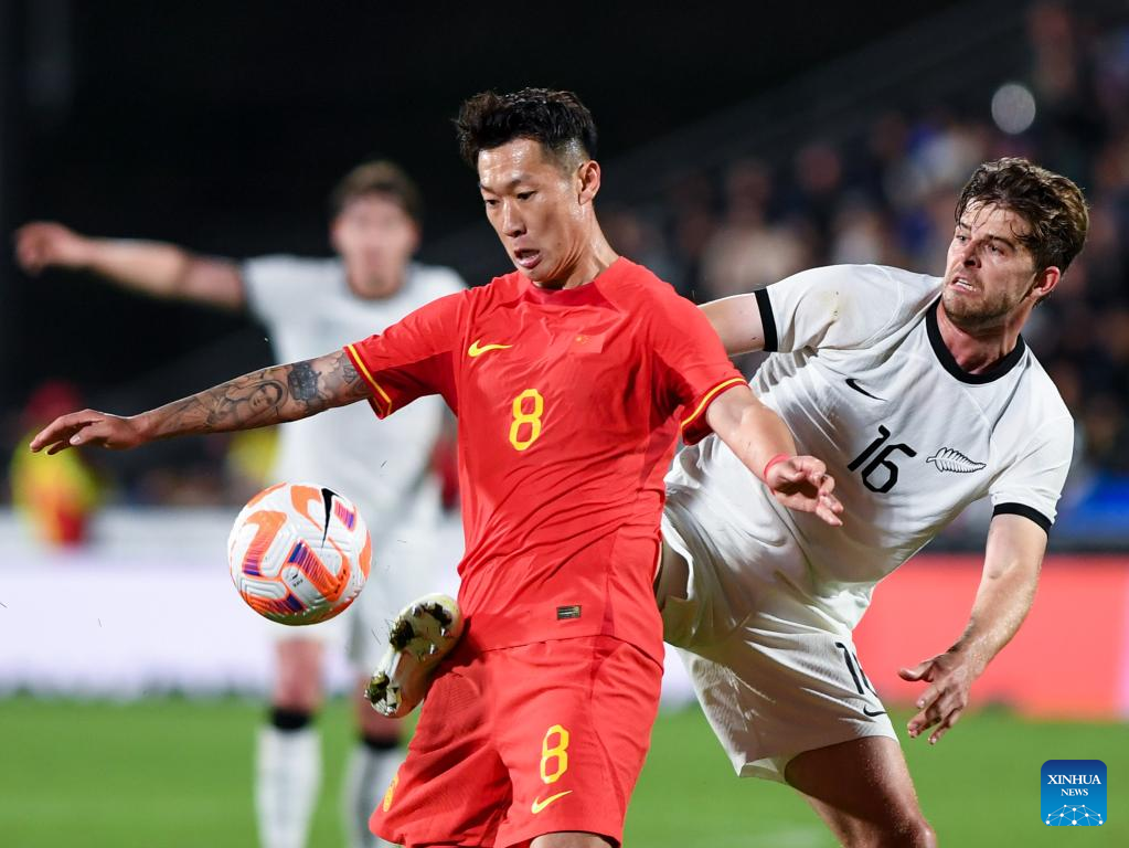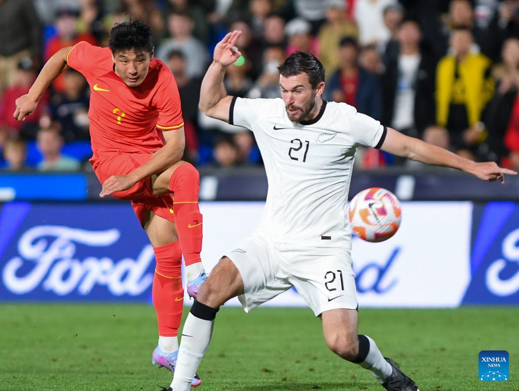Wu Lei (L) of China controls the ball during an international freindly match between New Zealand and China in Auckland, New Zealand, March 23, 2023. (Xinhua/Guo Lei)