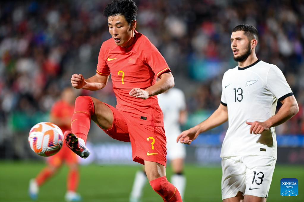 Wei Shihao of China controls the ball during an international freindly match between New Zealand and China in Auckland, New Zealand, March 23, 2023. (Xinhua/Guo Lei)