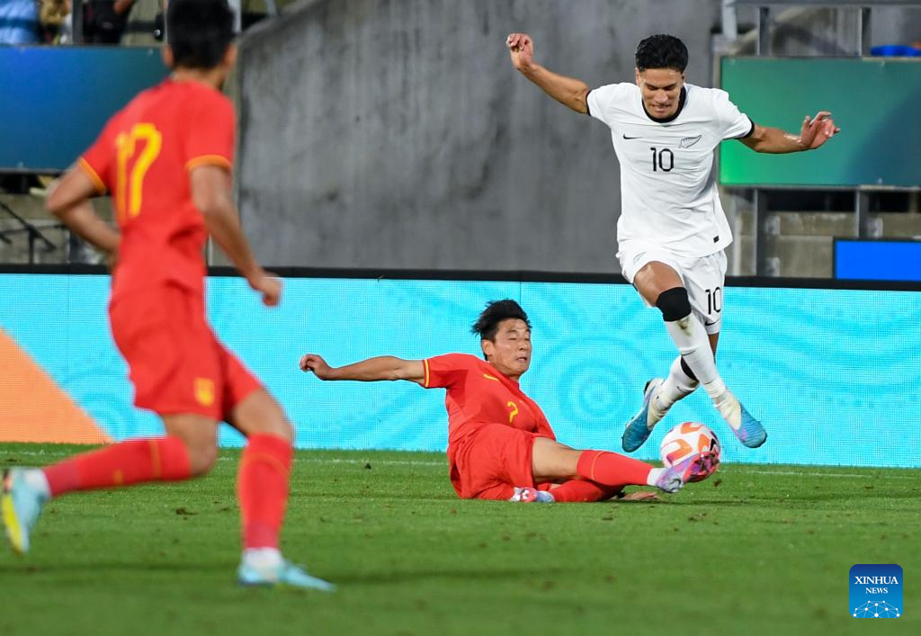 Xu Xin (L) of China vies with Alex Rufer of New Zealand during an international freindly match between New Zealand and China in Auckland, New Zealand, March 23, 2023. (Xinhua/Guo Lei)