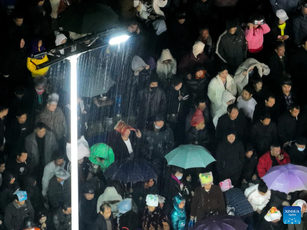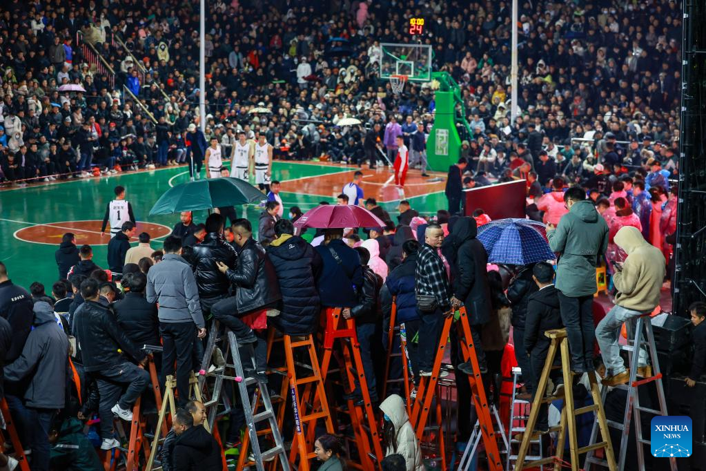 Villagers gather prior to a basketball game between Team Tongren and Team Qiandongnan held in Taipan Village, Taijiang County, southwest China's Guizhou Province, March 25, 2023. "Village Basketball Association" or "Village BA", is a grassroot basketball tournament held in Taipan Village. Organized by local residents, this event has gained popularity over the years and draws a large crowd of spectators and participants alike. The tournament showcases the passion and skills of basketball players from rural areas, as they compete and demonstrate their teamwork on the court. (Xinhua/Li Ga)