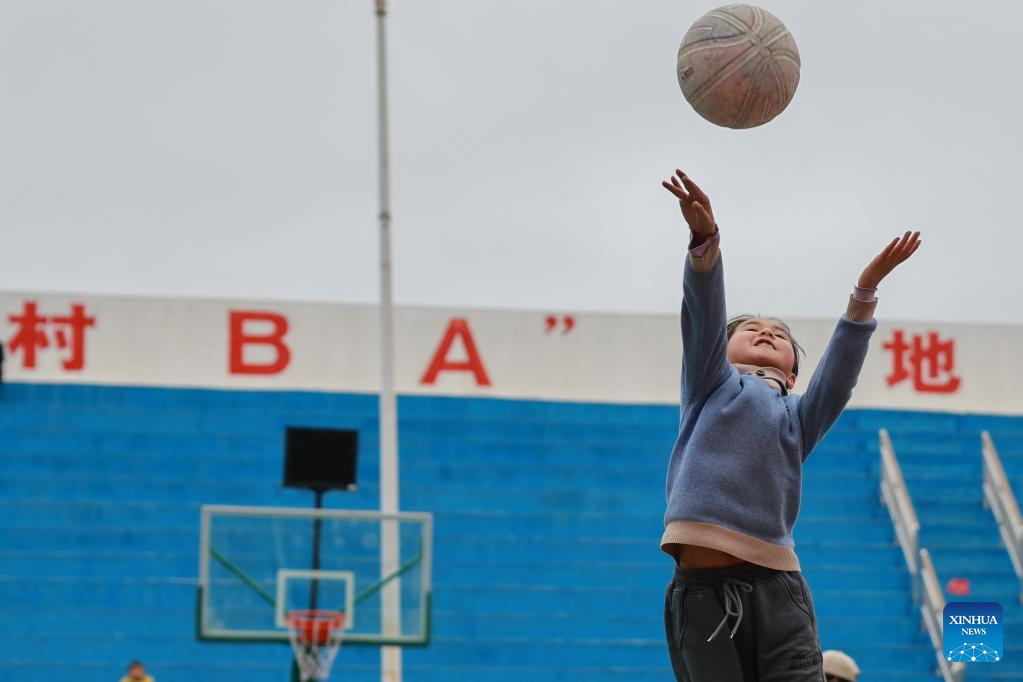 A kid plays basketball in Taipan Village, Taijiang County, southwest China's Guizhou Province, March 25, 2023. "Village Basketball Association" or "Village BA", is a grassroot basketball tournament held in Taipan Village. Organized by local residents, this event has gained popularity over the years and draws a large crowd of spectators and participants alike. The tournament showcases the passion and skills of basketball players from rural areas, as they compete and demonstrate their teamwork on the court. (Xinhua/Ou Dongqu)