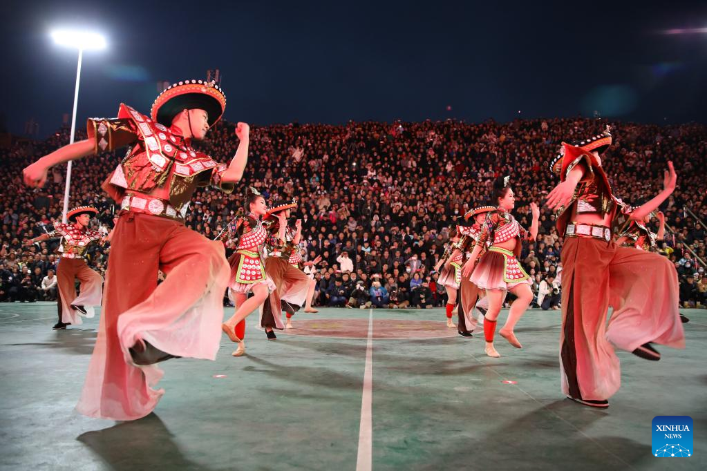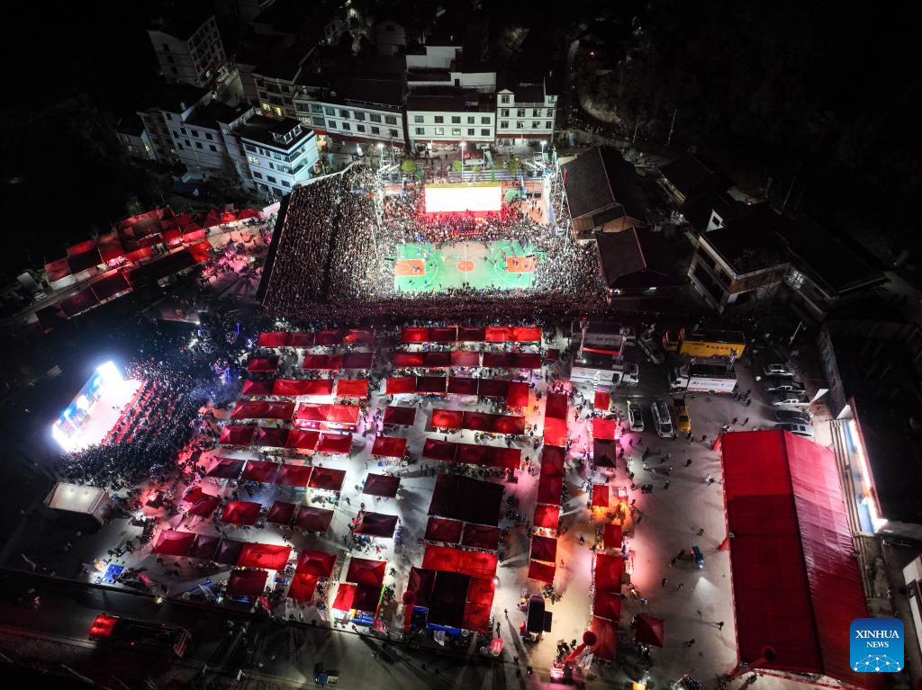 Artists dance prior to a basketball game between Team Tongren and Team Qiandongnan held in Taipan Village, Taijiang County, southwest China's Guizhou Province, March 25, 2023. "Village Basketball Association" or "Village BA", is a grassroot basketball tournament held in Taipan Village. Organized by local residents, this event has gained popularity over the years and draws a large crowd of spectators and participants alike. The tournament showcases the passion and skills of basketball players from rural areas, as they compete and demonstrate their teamwork on the court. (Xinhua/Liu Xu)