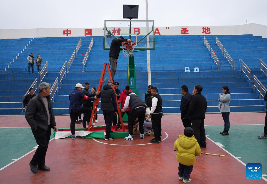 Staffs set up the basket prior to a basketball game between Team Tongren and Team Qiandongnan held in Taipan Village, Taijiang County, southwest China's Guizhou Province, March 25, 2023. "Village Basketball Association" or "Village BA", is a grassroot basketball tournament held in Taipan Village. Organized by local residents, this event has gained popularity over the years and draws a large crowd of spectators and participants alike. The tournament showcases the passion and skills of basketball players from rural areas, as they compete and demonstrate their teamwork on the court. (Xinhua/Li Ga)