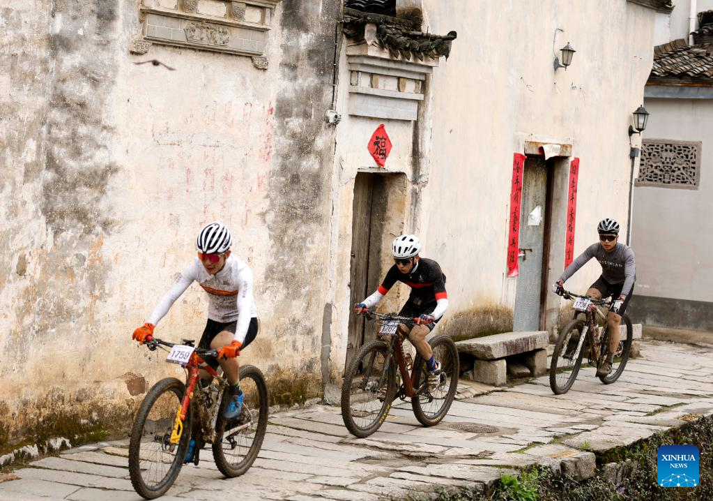 Cyclists compete during the men's MTB Race of the 18th China Huangshan (Yixian) International Cycling Open in Yixian, east China's Anhui Province. The cycling event kicked off here on Saturday. (Xinhua/Zhang Chen)