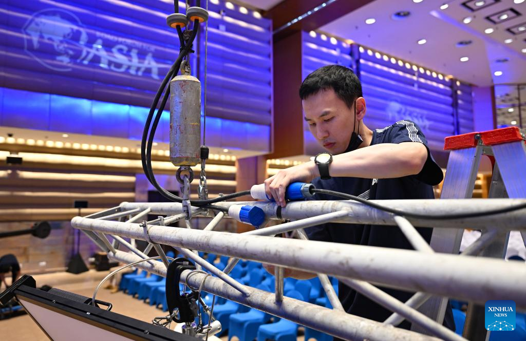 Staff members make preparation at a venue for a subforum of the Boao Forum for Asia (BFA) Annual Conference 2023 in Boao, south China's Hainan Province, March 24, 2023. The BFA will hold its annual conference from March 28 to 31 in Boao, a coastal town in China's island province of Hainan. (Xinhua/Guo Cheng)