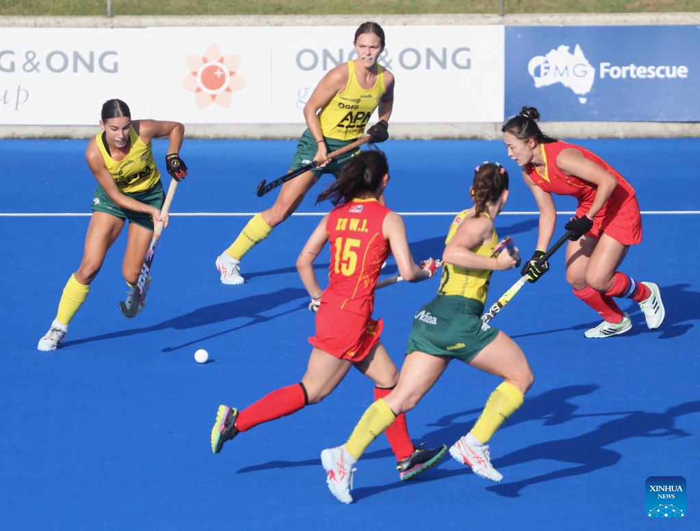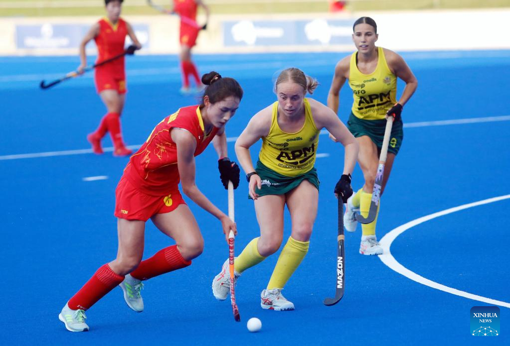 Ou Zixia (1st R) of China compete during a women's hockey friendly match against Australia in Perth, Australia on March 25, 2023. (Photo by Zhou Dan/Xinhua)