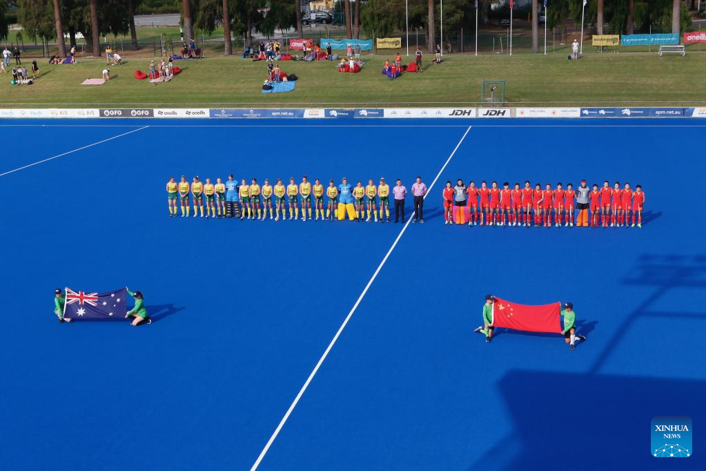Players of both side line up prior to a women's hockey friendly match between China and Australia in Perth, Australia on March 25, 2023. (Photo by Zhou Dan/Xinhua)