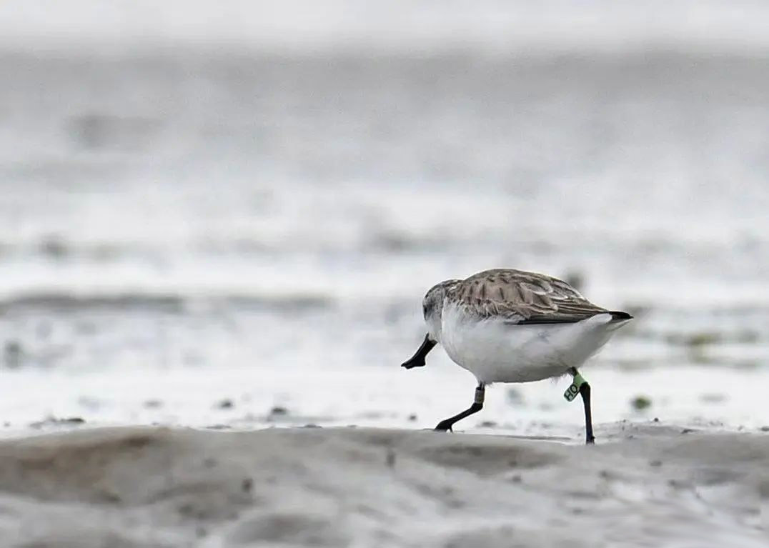 A spoon-billed sandpiper wearing a band forages in Weitou Bay, Quanzhou city, southeast China’s Fujian Province. (Photo/Chen Wensen)