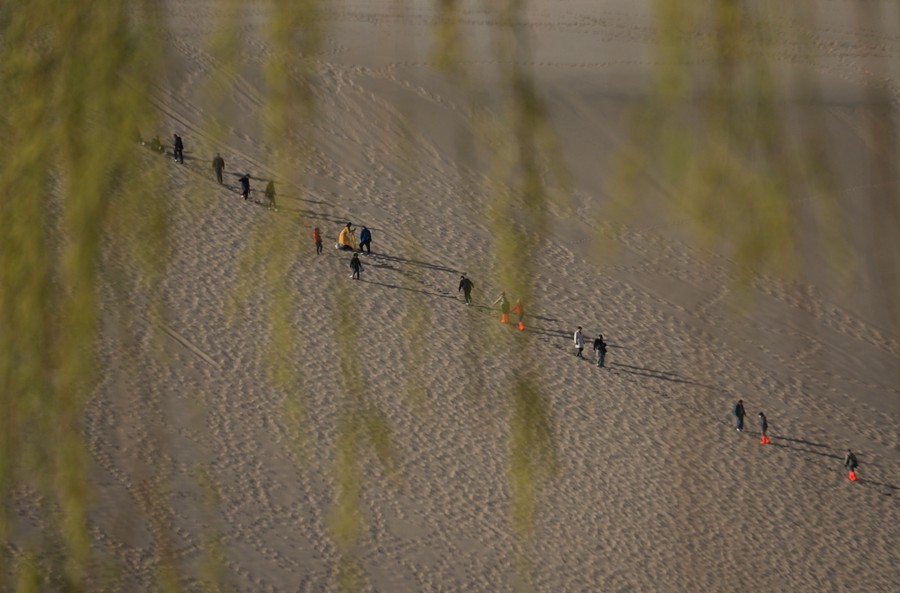 Photo shows visitors in the desert of the Crescent Moon Spring scenic area in Dunhuang city, northwest China’s Gansu Province. (Photo/Zhang Xiaoliang)