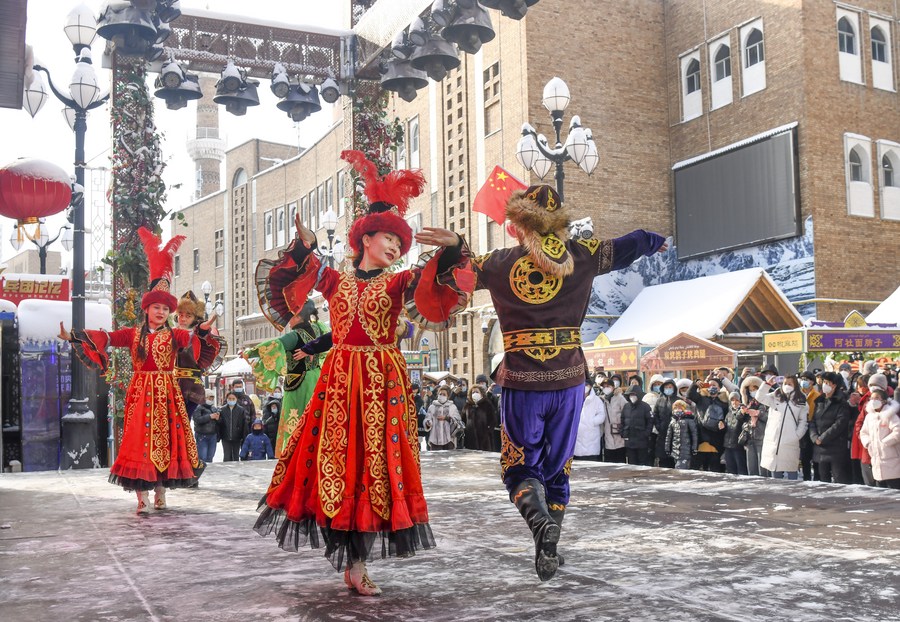 Performers dance at the grand bazaar in Urumqi, northwest China's Xinjiang Uygur Autonomous Region, Jan. 23, 2023. (Xinhua/Wang Fei)