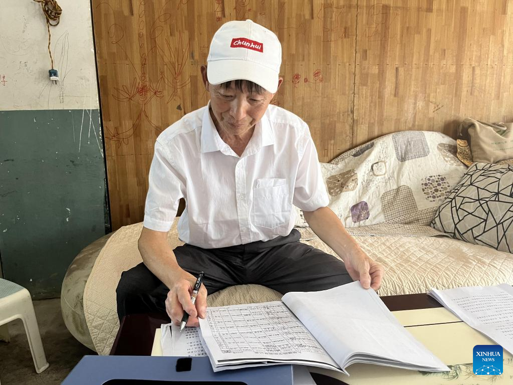 This photo taken with a mobile phone shows Huang Jinlong arranging records of students whom he has helped in Jiuba Town of Zunyi, southwest China's Guizhou Province, Aug. 24, 2022. (Xinhua/Li Jingya)
