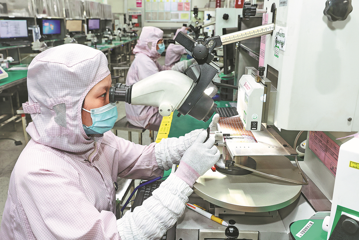 Employees work on the production line of a microelectronics company in Nantong, Jiangsu province. XU CONGJUN/FOR CHINA DAILY