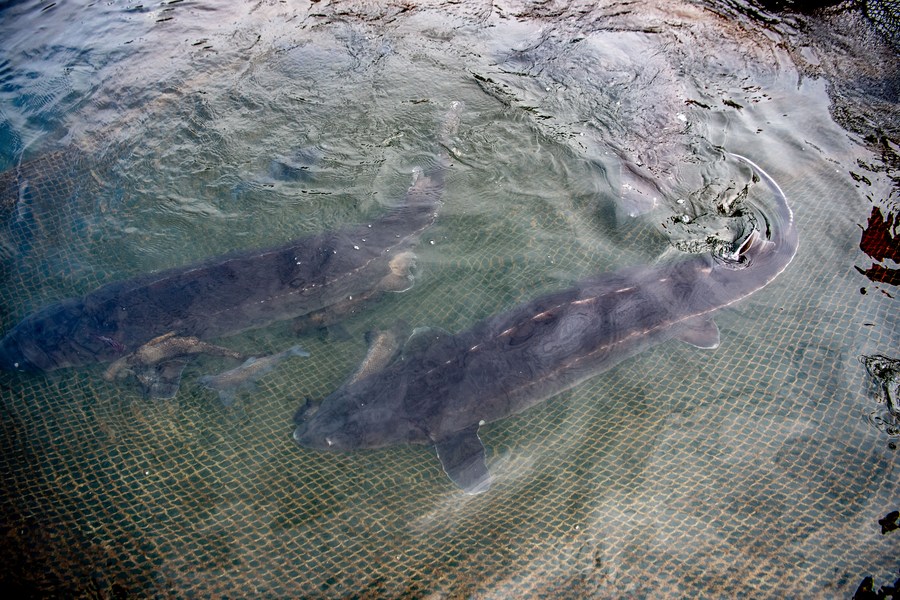 The test was launched in July 2022 in a tributary of the Yangtze in Jiang'an County, southwest China's Sichuan Province. On March 19, 20 sexually mature sturgeon, 10 males and 10 females, were placed into net cages that have been monitored around the clock.