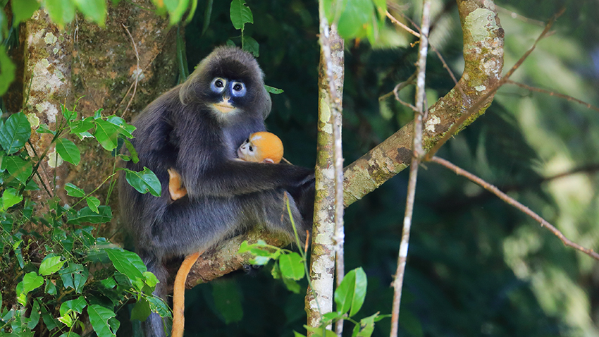 Photo shows a baby Phayre's leaf monkey cuddling with its parent in the lush forest of Mangshi city, Dehong Dai and Jingpo Autonomous Prefecture, southwest China’s Yunnan Province. (Photo/Zheng Shanhe)