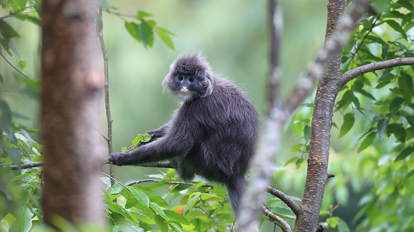 Photo shows a Phayre's leaf monkey in the lush forest of Mangshi city, Dehong Dai and Jingpo Autonomous Prefecture, southwest China’s Yunnan Province. (Photo/Zheng Shanhe)